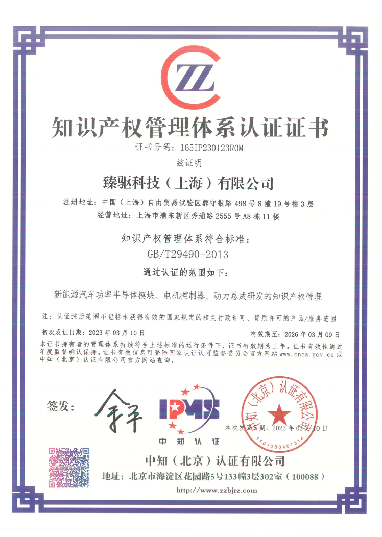 近日,從中知(北京)認證有限公司傳來喜訊,臻驅(qū)科技(上海)有限公司(以下簡稱“臻驅(qū)科技”)順利通過知識產(chǎn)權(quán)管理體系GB/T29490-2013認證,獲得《知識產(chǎn)權(quán)管理體系認證證書》,涉及新能源汽車功率半導體模塊、電機控制器、動力總成研發(fā)的知識產(chǎn)權(quán)管理。這標志著臻驅(qū)科技在知識產(chǎn)權(quán)規(guī)范化管理、知識產(chǎn)權(quán)運用、知識產(chǎn)權(quán)保護等方面的管理水平邁上新臺階。
