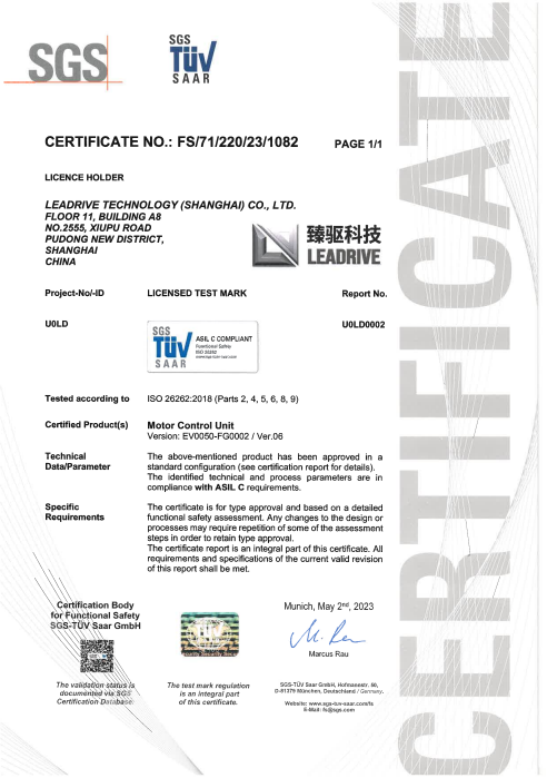 近日,國際權(quán)威第三方審核認(rèn)證機構(gòu)SGS為臻驅(qū)科技(上海)有限公司(以下簡稱“臻驅(qū)科技”)頒發(fā)ISO 26262:2018 ASIL C汽車功能安全產(chǎn)品認(rèn)證證書,該證書是臻驅(qū)科技獲得的首個功能安全產(chǎn)品認(rèn)證證書,也是繼2021年7月獲得“ISO 26262:2018 ASIL D汽車功能安全流程認(rèn)證證書”后,在汽車功能安全產(chǎn)品開發(fā)能力建設(shè)的又一重大里程碑。