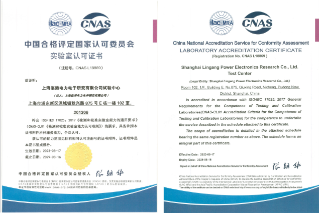 近日,上海臨港電力電子研究有限公司電力電子測(cè)試驗(yàn)證中心正式通過(guò)中國(guó)合格評(píng)定國(guó)家認(rèn)可委員會(huì)(CNAS)認(rèn)可,并獲得實(shí)驗(yàn)室認(rèn)可證書(shū)。