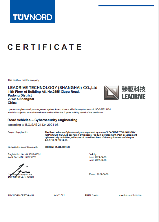 2024年5月11日,臻驅科技(上海)有限公司(以下簡稱“臻驅科技”)正式通過《ISO/SAE 21434道路車輛-網絡安全工程》(以下簡稱“ISO/SAE 21434”)汽車網絡安全管理體系認證,獲得此證書標志著臻驅科技已經建立了完整的汽車網絡安全管理體系,具備了產品網絡安全開發(fā)和管理能力,是公司體系建設中又一關鍵里程碑。